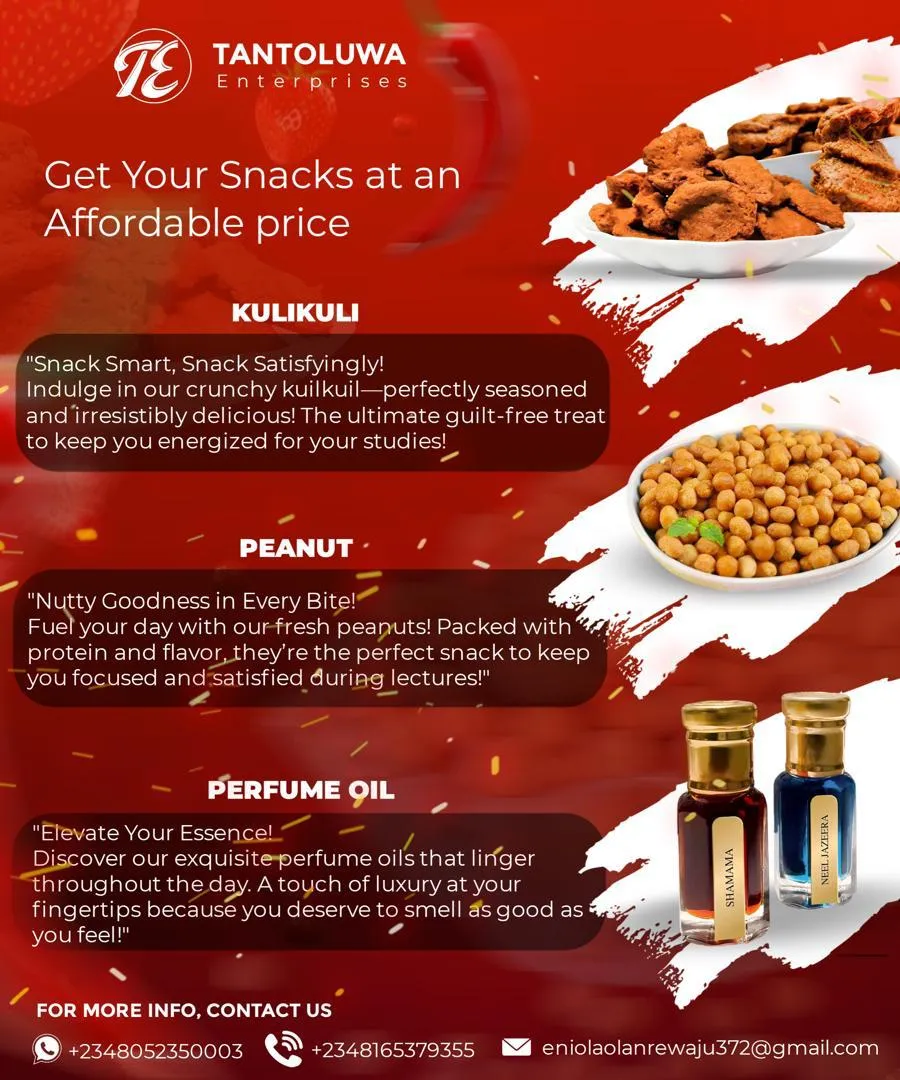 Tantoluwa’s Enterprise is a unique enterprise that specializes in offering a delightful products: perfume oils, kulikuli, and peanuts. Our perfume oils are carefully crafted to provide captivating fragrances, while our kulikuli is made with love to satisfy your snack cravings. We also sell peanuts, perfect for munching. With a focus on quality and customer satisfaction, we invite you to indulge in our products and experience the best!"